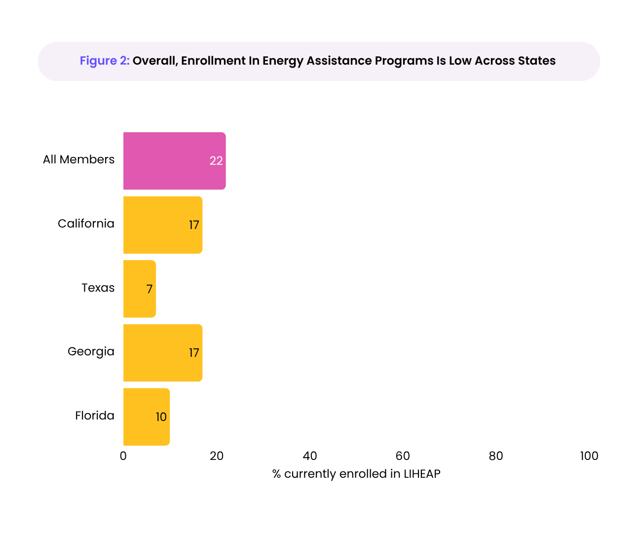Our earlier blog examined how high utility costs weigh on households in four key states: California, Texas, Georgia, and Florida. Despite widespread financial strain, enrollment in LIHEAP remained low across all four. Even in California, where outreach strategies are stronger, fewer than one in five members were enrolled in the program (Figure 2).