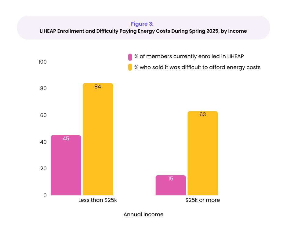 Yet even among these lowest-income households, energy hardship remains widespread and support isn’t guaranteed. Just 45% of members earning less than $25,000 reported receiving LIHEAP in the past year, even though 84% said it was difficult to afford their energy bills. The pattern was not isolated to very low-income households: among members earning $25,000 or more, 63% also reported difficulty affording energy costs, yet only 15% had enrolled in LIHEAP.