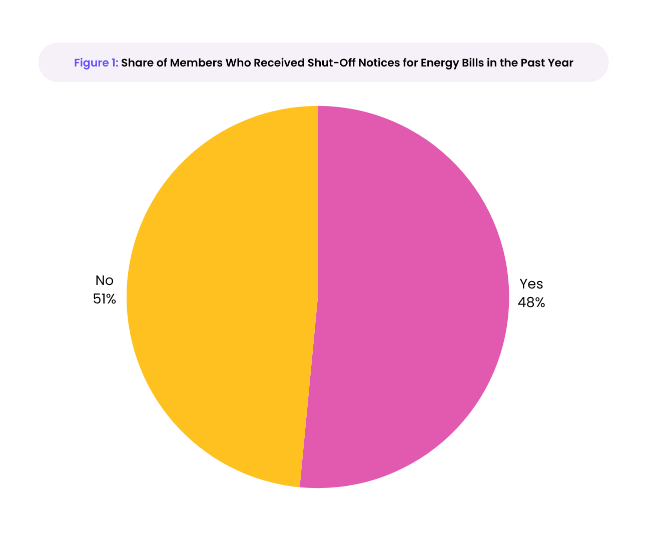 What’s especially concerning is the financial fragility beneath these burdens. Many members report sacrificing basic needs and taking on more debt to afford their home energy costs: 57% said they cut back on food, and nearly 40% reported increasing debt in the past six months due to unaffordable energy bills. This level of financial precarity turns energy costs into a compounding hardship for already unstable households. Managing these bills becomes a constant balancing act, where one unexpected spike can tip a household into crisis. In fact, nearly half of SaverLife members report receiving a utility shutoff notice in the past year (Figure 1).